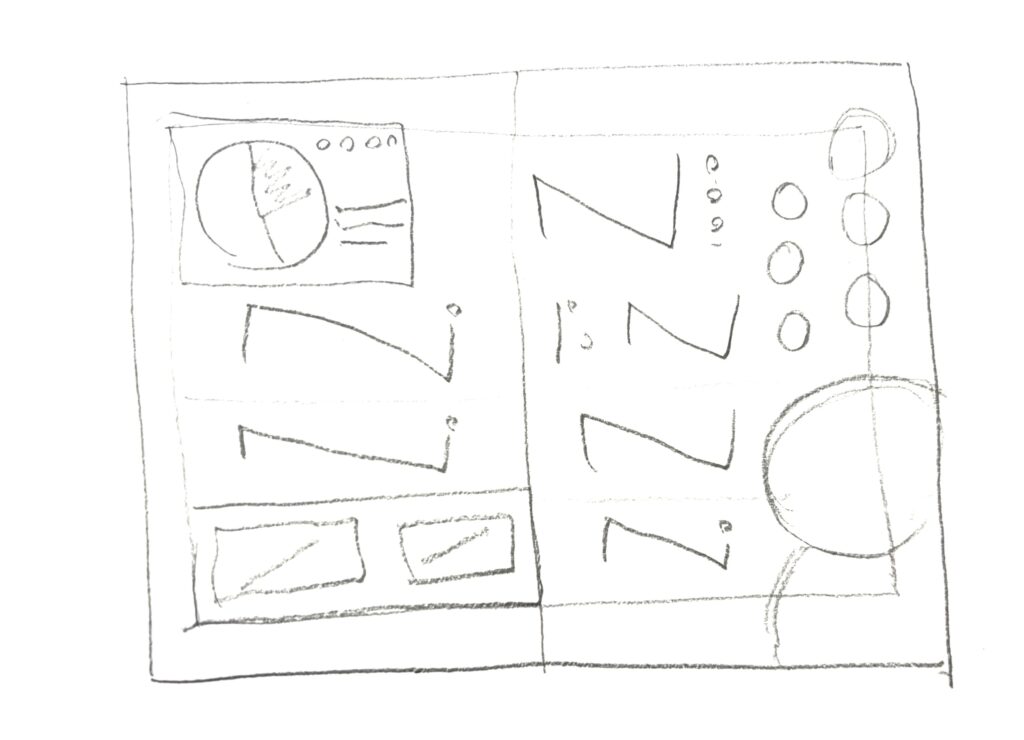 たちえばものすごく簡易的なラフがですが、どこにグラフおいたり、写真を入れたり、見出しを入れたりしたいかはわかりますよね?だれかの話の特集を出したいんだな、というような頭の中のイメージが伝わればOKです。そうすれば、だんだんと掲載できる文字数だったり、写真にはどんなイメージが欲しいかなど、具体的な方向性が見えてきます。